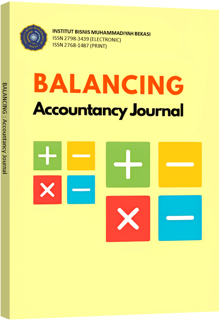BALANCING : Accountancy Journal - ISSN: 2798-3439 (Electronic) 2768-1487 (Print) adalah jurnal akses terbuka yang dikelola oleh Lembaga Penelitian dan Pengabdian kepada Masyarakat (LPPM) Institut Bisnis Muhammadiyah Bekasi, dan diterbitkan oleh Program Studi Akuntansi Fakultas Ekonomi dan Bisnis Institut Bisnis Muhammadiyah Bekasi. Jurnal ini diterbitkan 2 kali dalam setahun (Maret & Agustus), dengan ruang lingkup kajian sebagai berikut: