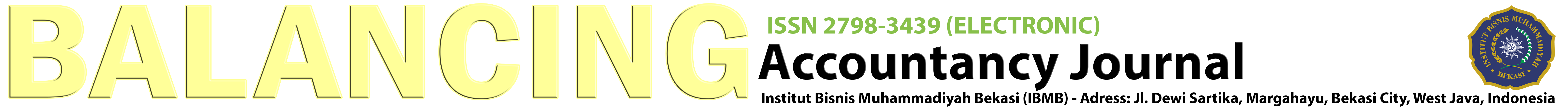 BALANCING : Accountancy Journal - ISSN: 2798-3439 (Electronic) 2768-1487 (Print) adalah jurnal akses terbuka yang dikelola oleh Lembaga Penelitian dan Pengabdian kepada Masyarakat (LPPM) Institut Bisnis Muhammadiyah Bekasi, dan diterbitkan oleh Program Studi Akuntansi Fakultas Ekonomi dan Bisnis Institut Bisnis Muhammadiyah Bekasi. Jurnal ini diterbitkan 2 kali dalam setahun (Maret & Agustus), dengan ruang lingkup kajian sebagai berikut: Akuntansi Keuangan, Auditing, Akuntansi Manajemen, Akuntansi Syari'ah, Akuntansi Sektor Publik, Sistem Informasi Akuntansi, dan Akuntansi Perpajakan.