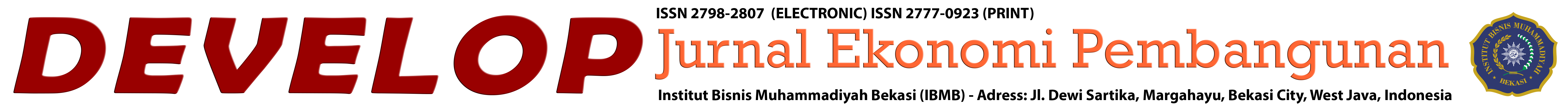 DEVELOP : Jurnal Ekonomi Pembangunan merupakan jurnal ilmiah yang dikelola oleh Lembaga Penelitian dan Pengabdian kepada Masyarakat (LPPM) Institut Bisnis Muhammadiyah Bekasi, dan diterbitkan oleh Program Studi Ekonomi Pembangunan Fakultas Ekonomi dan Bisnis Institut Bisnis Muhammadiyah Bekasi. Jurnal DEVELOP membahas kajian terkait bidang Ekonomi Moneter, Ekonomi Internasional, Ekonomi Perdagangan, Ekonomi Industri, Ekonomi Perkotaan dan Wilayah (Regional), Ekonomi Publik, Ekonomi SDA & lingkungan, dan Ekonomi SDA & Energi. Jurnal DEVELOP terbit dua kali setahun (semester genap terbit bulan Februari dan semester ganjil terbit bulan Agustus).