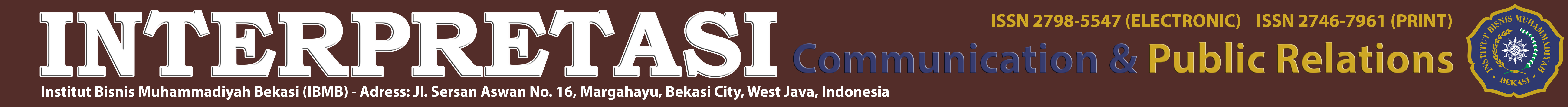 INTERPRETASI: Communication & Public Relations merupakan jurnal ilmiah yang dikelola oleh Lembaga Penelitian dan Pengabdian kepada Masyarakat (LPPM) Institut Bisnis Muhammadiyah Bekasi, dan diterbitkan oleh Program Studi Ilmu Komunikasi Fakultas Teknik dan Komunikasi Institut Bisnis Muhammadiyah Bekasi. Jurnal memuat hasil penelitian ilmiah dengan tema: Keilmuan Komunikasi, Public Relations, Media Industri, Marketing Pemasaran, sosiologi dan budaya. Jurnal ini terbit dua kali setahun (semester genap terbit bulan Juni dan semester ganjil terbit bulan Desember).