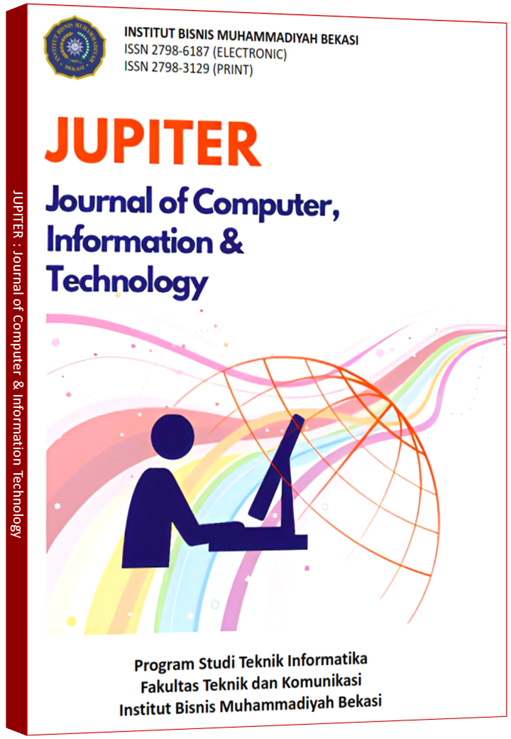 JUPITER : Journal of Computer & Information Technology merupakan jurnal ilmiah yang dikelola oleh Lembaga Penelitian dan Pengabdian kepada Masyarakat (LPPM) Institut Bisnis Muhammadiyah Bekasi, dan diterbitkan oleh Program Studi Teknik Informatika Fakultas Teknik dan Komunikasi Institut Bisnis Muhammadiyah Bekasi. JUPITER pertama kali diterbitkan pada Februari 2020 dengan ISSN 2798-6187 (Electronic) dan P-ISSN 2798-3129 (Print). Terbit dua kali setahun (semester Genap terbit bulan Agustus dan semester Ganjil terbit bulan Februari). JUPITER memuat hasil penelitian ilmiah dengan fokus dan ruang lingkup: Algoritma (Algorithm), Arsitektur Komputer (Computer Architecture), Kecerdasan Buatan (Artificial Intelligence), Komputer Grafik (Computer Graphics), Digital Forensik (Digital Forensics), Pengolahan citra (Image Processing), Interaksi Manusia Komputer (Human Computer Interaction), Internet of Things (Internet of Things), Jaringan (Networking), Keamanan Teknologi Informasi (Information Technology Security), Machine Learning (Machine Learning), Teknologi Game (Gaming Technology), Mobile Computing (Mobile Computing), Sistem Informasi (Information Systems), Sistem Informasi Geografis (Geographic Information Systems), Sistem Operasi (Operating System), Sistem Pakar (Expert System), Rekayasa Perangkat Lunak (Software Engineering), Robotika (Robotics), Pengalaman Pengguna (User Experience/UX), Antarmuka Pengguna (User Interface/UI),Teknologi Blockchain (Blockchain Technology), Jaringan Nirkabel (Wireless Network) |