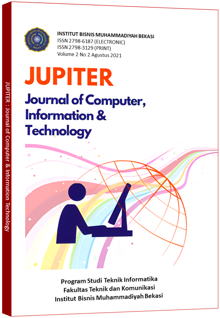 Vol. 2 No. 2 (2021)JUPITER : Journal of Computer & Information Technology merupakan jurnal ilmiah yang dikelola oleh Lembaga Penelitian dan Pengabdian kepada Masyarakat (LPPM) Institut Bisnis Muhammadiyah Bekasi, dan diterbitkan oleh Program Studi Teknik Informatika Fakultas Teknik dan Komunikasi Institut Bisnis Muhammadiyah Bekasi. JUPITER pertama kali diterbitkan pada Februari 2020 dengan ISSN 2798-6187 (Electronic) dan P-ISSN 2798-3129 (Print). Terbit dua kali setahun (semester Genap terbit bulan Agustus dan semester Ganjil terbit bulan Februari). JUPITER memuat hasil penelitian ilmiah dengan tema Algoritma, Arsitektur Komputer, Artificial Intelligence, Computer Graphics, Digital Forensics, Image Processing, Interaksi Manusia Komputer, Internet of Things, Jaringan, Keamanan Teknologi Informasi, Machine Learning, Teknologi Game, Mobile Computing, Sistem Informasi, Sistem Informasi Geografis, Sistem Operasi, Sistem Pakar, Rekayasa Perangkat Lunak, Robotika, User Experience (UX), User Interface (UI), Teknologi Blockchain, dan Wireless Network.