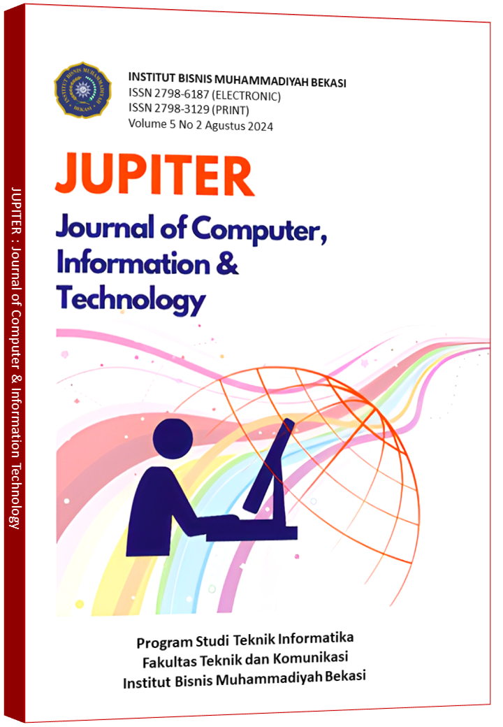Vol. 5 No. 2 (2024)JUPITER : Journal of Computer & Information Technology merupakan jurnal ilmiah yang dikelola oleh Lembaga Penelitian dan Pengabdian kepada Masyarakat (LPPM) Institut Bisnis Muhammadiyah Bekasi, dan diterbitkan oleh Program Studi Teknik Informatika Fakultas Teknik dan Komunikasi Institut Bisnis Muhammadiyah Bekasi. JUPITER pertama kali diterbitkan pada Februari 2020 dengan ISSN 2798-6187 (Electronic) dan P-ISSN 2798-3129 (Print). Terbit dua kali setahun (semester Genap terbit bulan Agustus dan semester Ganjil terbit bulan Februari). JUPITER memuat hasil penelitian ilmiah dengan tema Algoritma, Arsitektur Komputer, Artificial Intelligence, Computer Graphics, Digital Forensics, Image Processing, Interaksi Manusia Komputer, Internet of Things, Jaringan, Keamanan Teknologi Informasi, Machine Learning, Teknologi Game, Mobile Computing, Sistem Informasi, Sistem Informasi Geografis, Sistem Operasi, Sistem Pakar, Rekayasa Perangkat Lunak, Robotika, User Experience (UX), User Interface (UI), Teknologi Blockchain, dan Wireless Network.