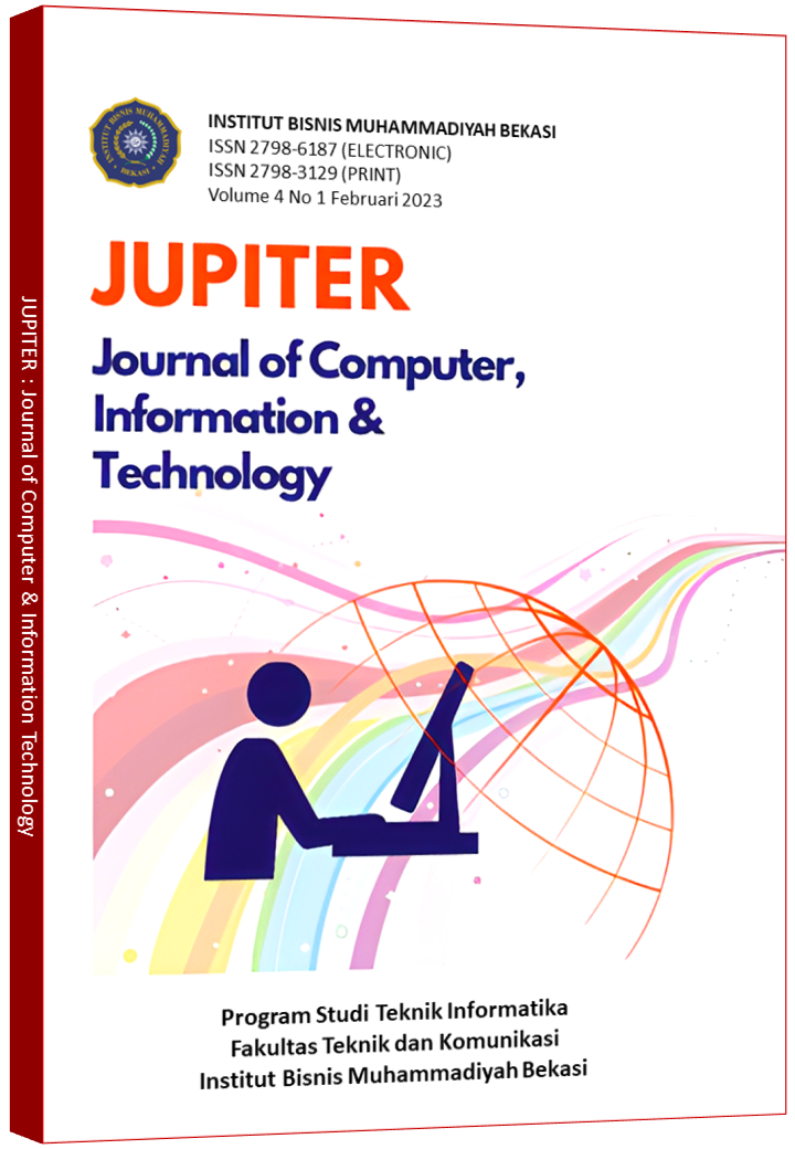 Vol. 4 No. 2 (2023)JUPITER : Journal of Computer & Information Technology merupakan jurnal ilmiah yang dikelola oleh Lembaga Penelitian dan Pengabdian kepada Masyarakat (LPPM) Institut Bisnis Muhammadiyah Bekasi, dan diterbitkan oleh Program Studi Teknik Informatika Fakultas Teknik dan Komunikasi Institut Bisnis Muhammadiyah Bekasi. JUPITER pertama kali diterbitkan pada Februari 2020 dengan ISSN 2798-6187 (Electronic) dan P-ISSN 2798-3129 (Print). Terbit dua kali setahun (semester Genap terbit bulan Agustus dan semester Ganjil terbit bulan Februari). JUPITER memuat hasil penelitian ilmiah dengan tema Algoritma, Arsitektur Komputer, Artificial Intelligence, Computer Graphics, Digital Forensics, Image Processing, Interaksi Manusia Komputer, Internet of Things, Jaringan, Keamanan Teknologi Informasi, Machine Learning, Teknologi Game, Mobile Computing, Sistem Informasi, Sistem Informasi Geografis, Sistem Operasi, Sistem Pakar, Rekayasa Perangkat Lunak, Robotika, User Experience (UX), User Interface (UI), Teknologi Blockchain, dan Wireless Network.